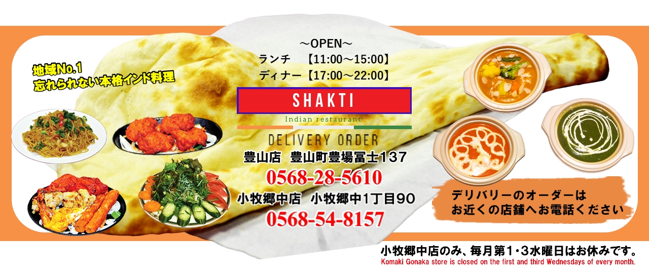 シャクティは、カレーやナン、タンドリーカバブを中心としたインドネパール料理のお店です。2016年に豊山にオープンし、2021年5月には小牧に2号店をオープンしました。地域の皆様に愛されながら現在に至っています。おいしい料理を用意してお持ちしています。是非お近くの店舗へお越し下さい。