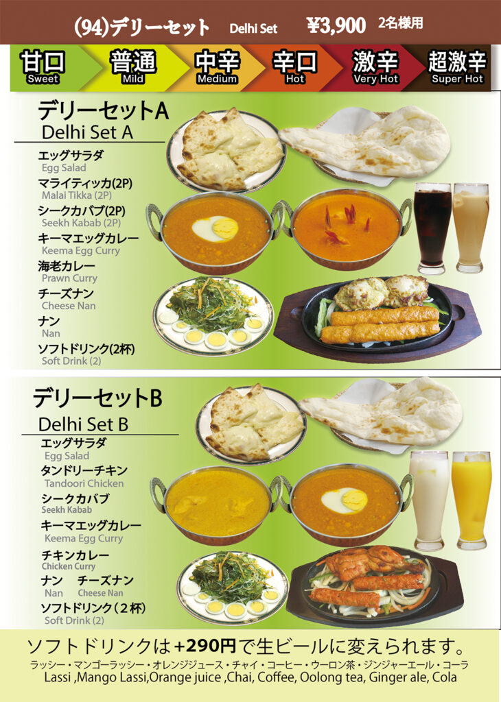 オレンジジュース、コーラ、ジンジャーエール、ウーロン茶、ラッシー、マンゴーラッシー、コーヒー、チャイ(アイスorホット)
