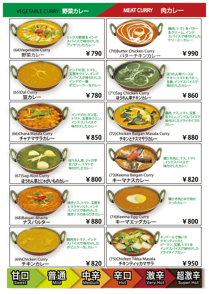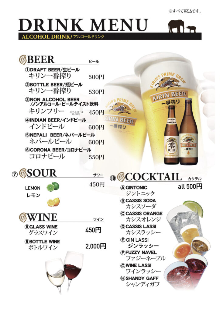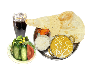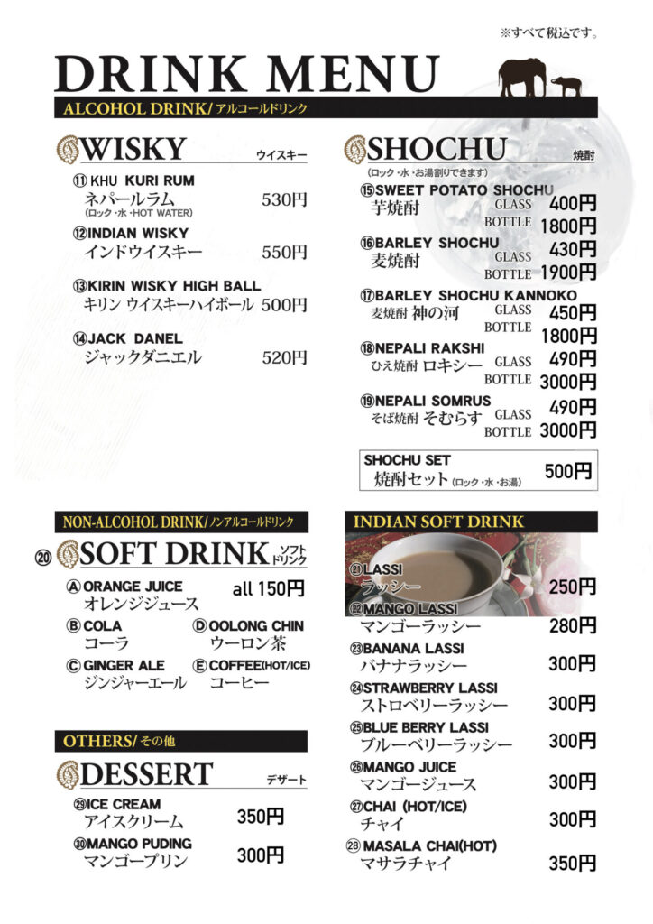 オレンジジュース、コーラ、ジンジャーエール、ウーロン茶、ラッシー、マンゴーラッシー、アイスコーヒー、アイスチャイ Drink Orange juice,cola,Ginger ale,Oolongtea,lassi,Mango lassi,Coffee,Tea (Hot/Ice)